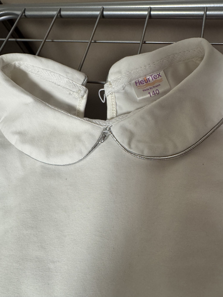 Дизайн модели дополнен кантом с серебряным люрексом по краю воротника, который придаёт лёгкий блеск и делает блузку более нарядной. Классический воротник сохраняет строгий стиль, соответствующий школьному дресс-коду, а застёжка на пуговицу сзади облегчает надевание и добавляет аккуратный декоративный элемент в спинке изделия.